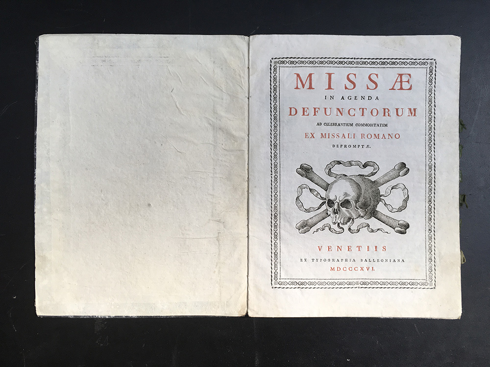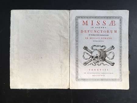 Missae in agenda defunctorum. Venezia: Balleoniana, 1816. Folio, teschio xilografico al frontespizio. Legatura coeva in cartonato. Non collazionato e difetti da esaminare.