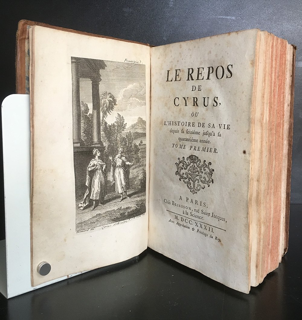 PERNETTI, Jacques. Le repos de Cyrus, ou l'histoire de sa vie depuis sa seizième jusqu'à sa quarantième année. Parigi: Briasson, 1732. 8vo, bella copia in pelle corva con dorso decorato in oro e tagli a spruzzo rossi. Numerose tavole incise in rame. Non collazionato e difetti da esaminare.