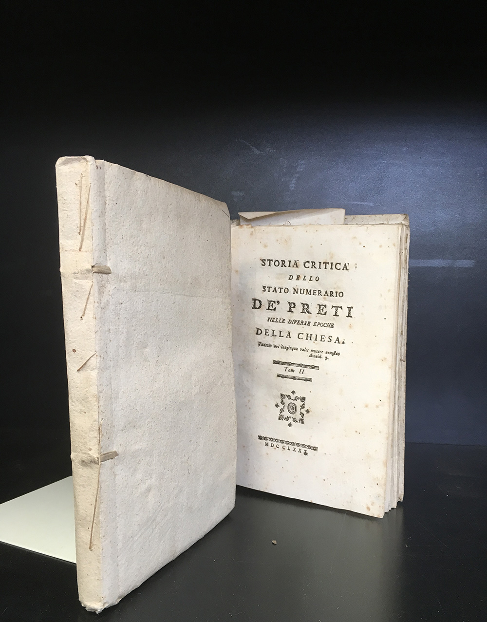 [STORIA] Storia critica dello stato numeriario de' preti nelle diverse epoche della chiesa. s.l: s.e., 1780. 8vo, 2 voll, testatine e finalini xilografici. Brossura coeva in cartonato. Interessante saggio di area illuminista sul numero degli ecclesiastici nella storia e sulla necessità di ridurne le schiere per preferire le vere vocazioni e una corretta preparazione. Non collazionato e difetti da esaminare.