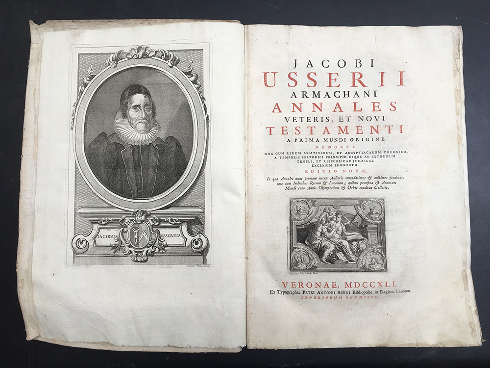USSHER, Jacopo. Annales veteris et novi Testamenti, a prima mundi origine deducti. Verona: Pietro Antonio Berni, 1741. Folio, antiporta incisa in rame con ritratto dell'autore, frontespizio in rosso e nero con grande vignetta xilografica, cartone coevo. Non collazionato e difetti da esaminare.