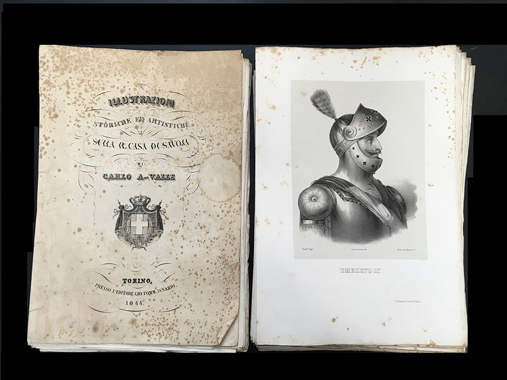 VALLE C. Illustrazioni storiche ed artistiche sulla r. casa di Savoja. Torino: Isnardi, 1844. Folio, solo 1 volume. diverse litografie nel testo. fioriture diffuse. Privo di legatura. Non collazionato e difetti da esaminare.