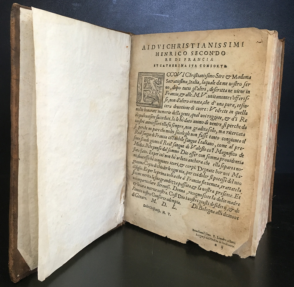 ALBERTI, Leandro. Descrittione di tutta l'Italia. Bologna: Anselmo Giaccarelli, 1550. 4to, legatura del XVII-XVIII secolo in pieno vitello con decori e titolo in oro su tassello al droso, tagli marmorizzati. Esemplare acefalo e scompleto della prima edizione della celebre descrizione dell'Alberti. Non collazionato e difetti da esaminare.