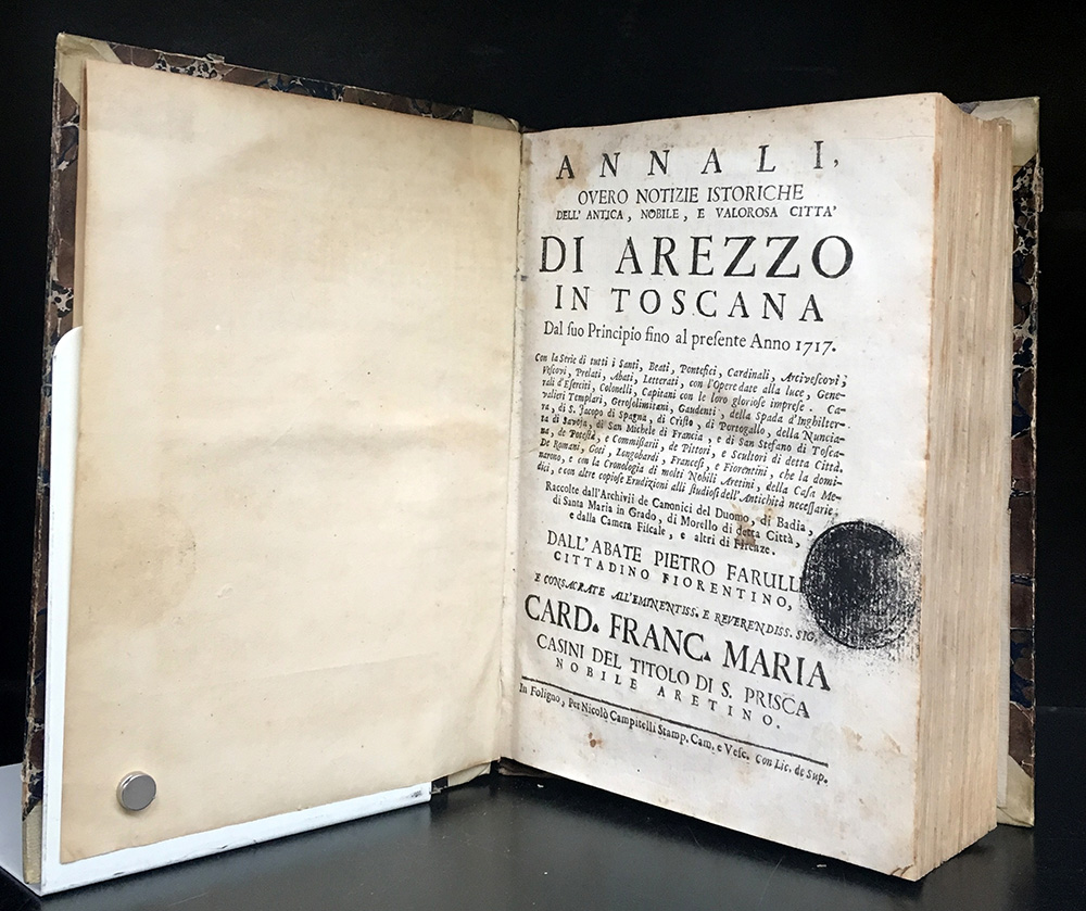 [AREZZO] FARULLI Pietro. Annali ovvero notizie storiche dell’antica, nobile, e valorosa città di Arezzo in Toscana dal suo principio fino al presente anno 1717. Foligno: Nicolò Campitelli, 1717. 8vo. Legatura in mezza pergamena. Prima edizione molto rara. Non collazionato e difetti da esaminare.