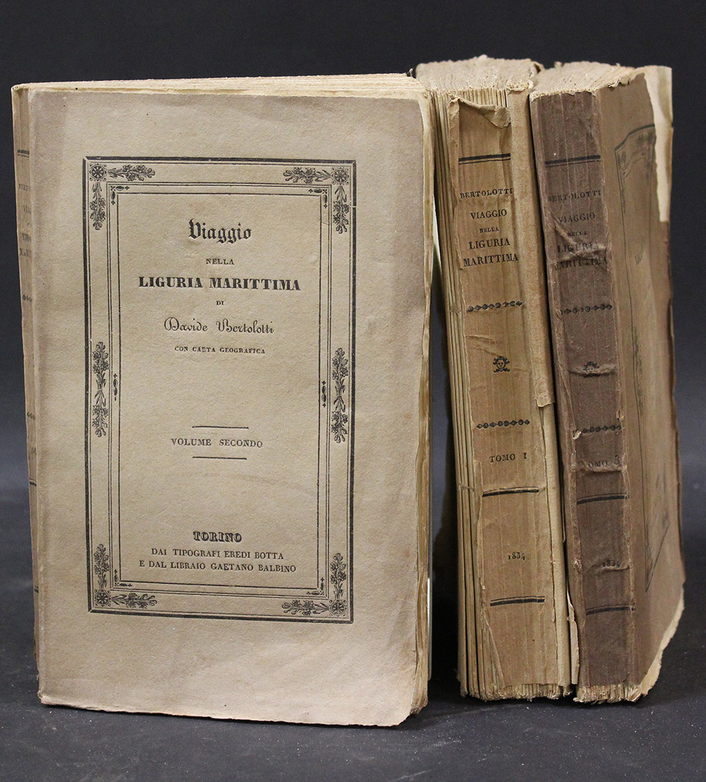 [LIGURIA] BERTOLOTTI, Davide. Viaggio nella Liguria marittima. Torino: Botta, 1834. 3 volumi, 4to. Brossura editoriale stampata in nero. Non collazionato e difetti da esaminare.
