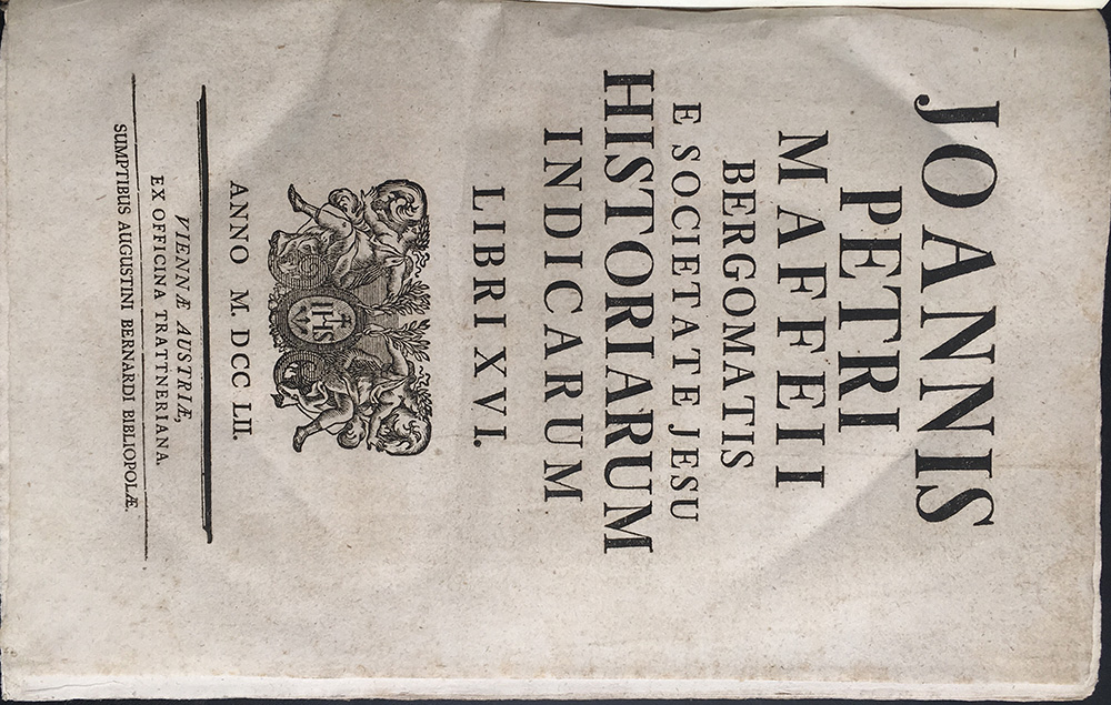 MAFFEI, Giovanni Pietro (1533-1603). Joannis Petri Maffeii Bergomatis E Societate Jesu Historiarum Indicarum Libri XVI. Vienna: Ex officina Trattneriana, 1752. Foio, mezza pelle quasi coeva. Non collazionato e difetti da esaminare.