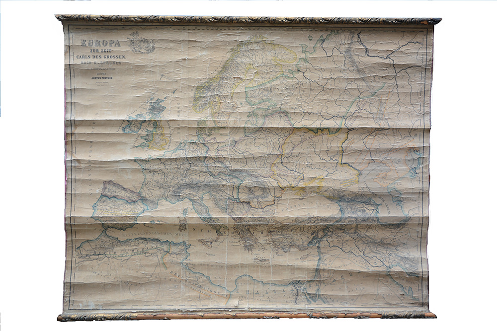 [MAPPA] SPRUNER K. Europa zur zeit Carls des Grossen. Gotha: Perthes [ca. 1850] (1250mm x 1580mm) Stampata a colori,carta applicata su tela, sostegni coevi in legno intagliato e dorato (difetti) Grande mappa da parete che mostra le divisioni dell'Europa all'epoca di Carlo il Grosso