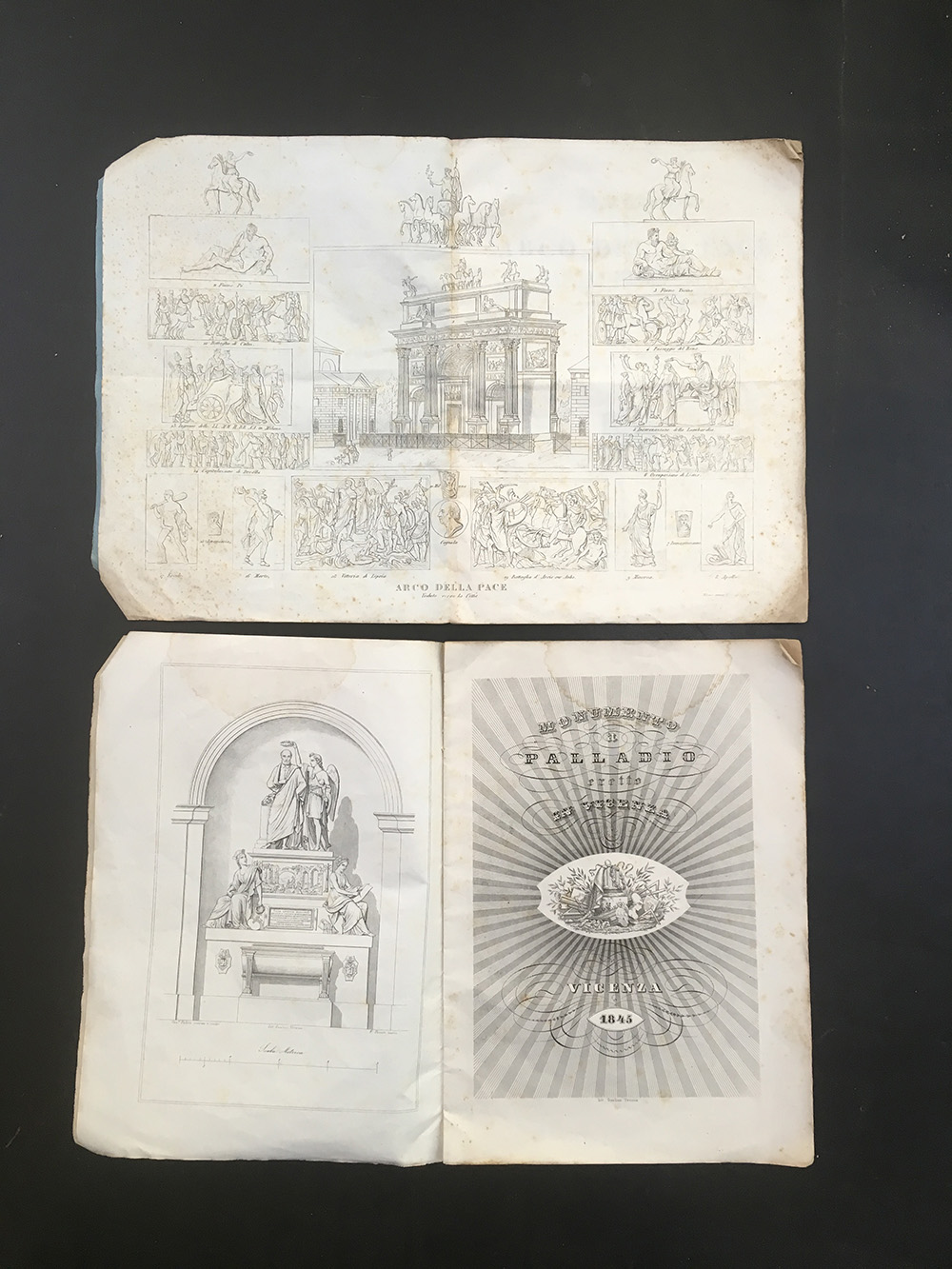 [MILANO] REINA G. Descrizione dell'arco della pace in Milano. Milano: Rocchetti e Ferreri, 1843. 4to, 2 tavole a doppia pagina raffiguranti l'arco della pace. brossura editoriale stampata; BERTI Monumento a Palladio. Vicenza, 1843. 4to, frontespizio inciso, 3 tavole