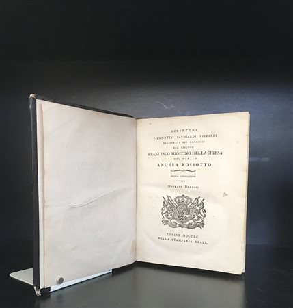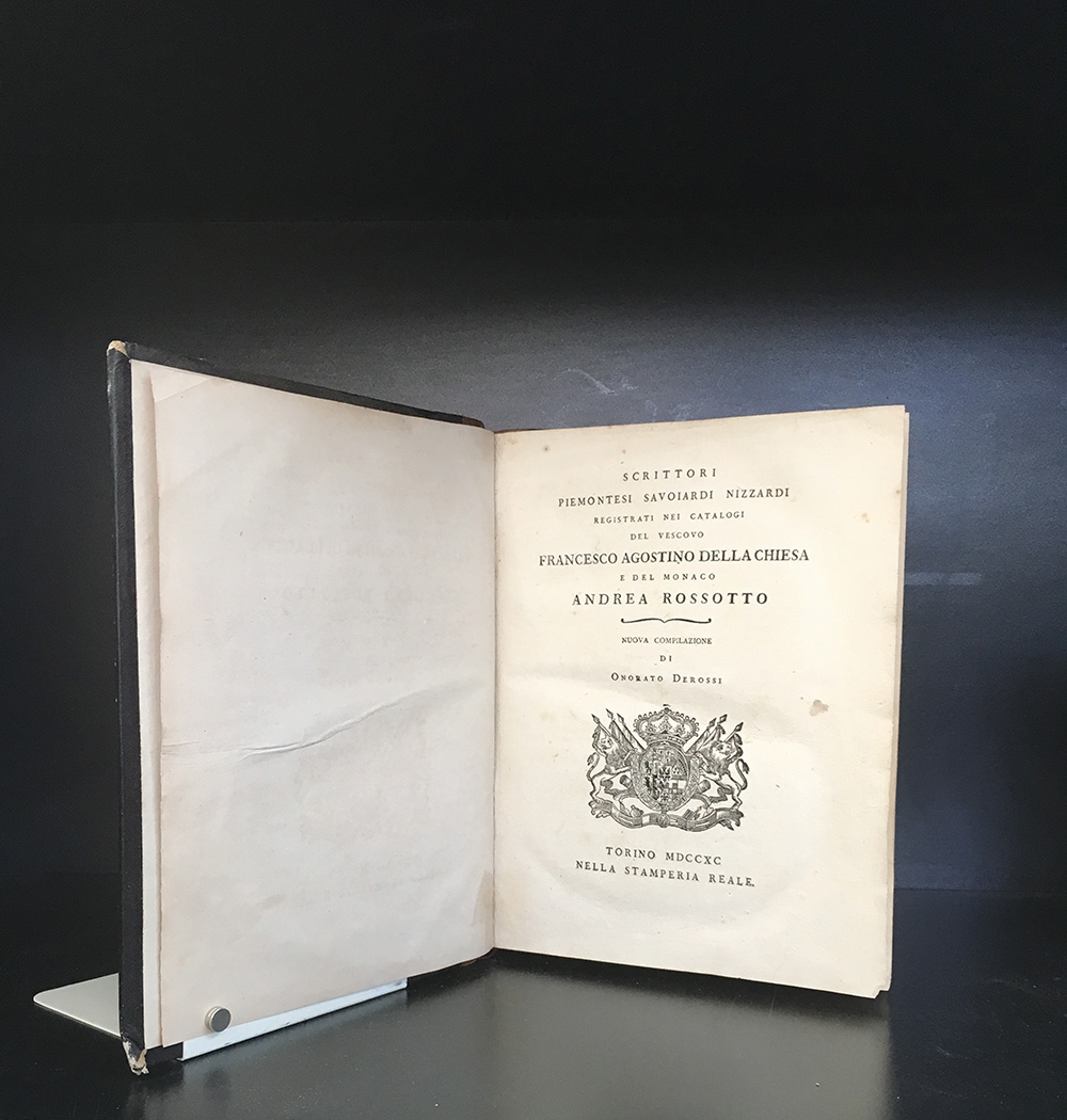 [PIEMONTE] DEROSSI O. Scrittori piemontesi savoiardi nizzardi registrati nei catalogi del vescovo Francesco Agostino della Chiesa e de monaco Andrea Rossotto. Torino: Stamperia reale,1790. 4to, stemma sabaudo al frontespizio. Legatura del XIX secolo in mezza pella con titolo e decori in oro al dorso. Raro repertorio bibliografico dedicato agli scrittori degli stati sabaudi. Non collazionato e difetti da esaminare.