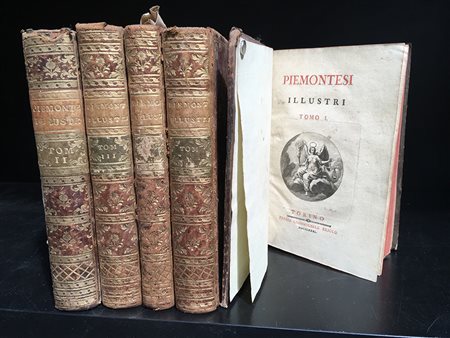 [PIEMONTE] Piemontesi illustri Torino: Giammichele Briolo, 1781-87. 5 volumi, 8vo (188 x 121mm). Grande vignetta calcografica ai frontespizi, il primo stampato in rosso e nero con un'incisione in rame nel testo e una a piena pagina fuori testo (alcune macchie dovute alla polvere, senza ultima bianca al vol. II e X1-2 in fine al vol. IV). Pelle coeva decorata in oro, tagli rossi (graffiata e con alcune piccole perdite e tarli). (5)