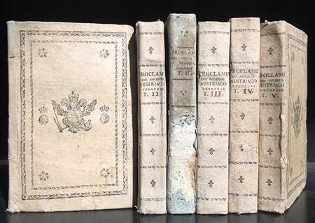 [VERONA]. Raccolta di tutte le leggi ordinazioni e proclami pubblicati, e stampati per il governo della città di Verona e suo distretto dopo il fausto felicissimo ingresso dell'armi austriache di S.M. Regia Imperiale Francesco Secondo. Verona: Moroni, 1798. 5 volumi n 8vo, brossura editoriale stampata in nero. Si aggiunge il vol. II della Raccolta di tutti gli ordini, e proclamazioni del presente governo dello stato maggiore francese che della municipalità di Verona. (s.d.). Non collazionato e difetti da esaminare.