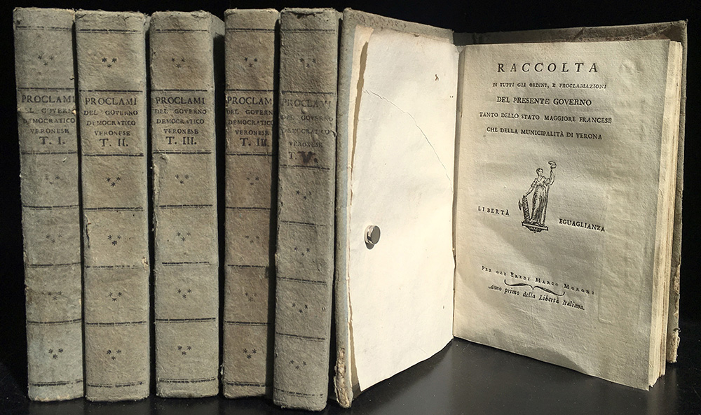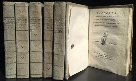 [VERONA]. Raccolta di tutti gli ordini, e proclamazioni del presente governo dello stato maggiore francese che della municipalità di Verona. [Verona:] Moroni, s.d. 6 volumi in 8vo, brossura editoriale coeva stampata in nero (alcune perdite alla brossura). Non collazionato e difetti da esaminare.