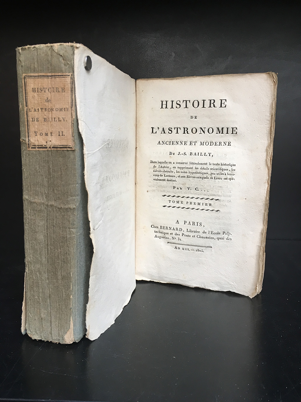 BAILLY, J.S. Histoire de l'astronomie ancienne et moderne. Parigi: Bernard, 1805. 2 volumi, 8vo, brossura coeva azzurra. Non collazionato e difetti da esaminare.