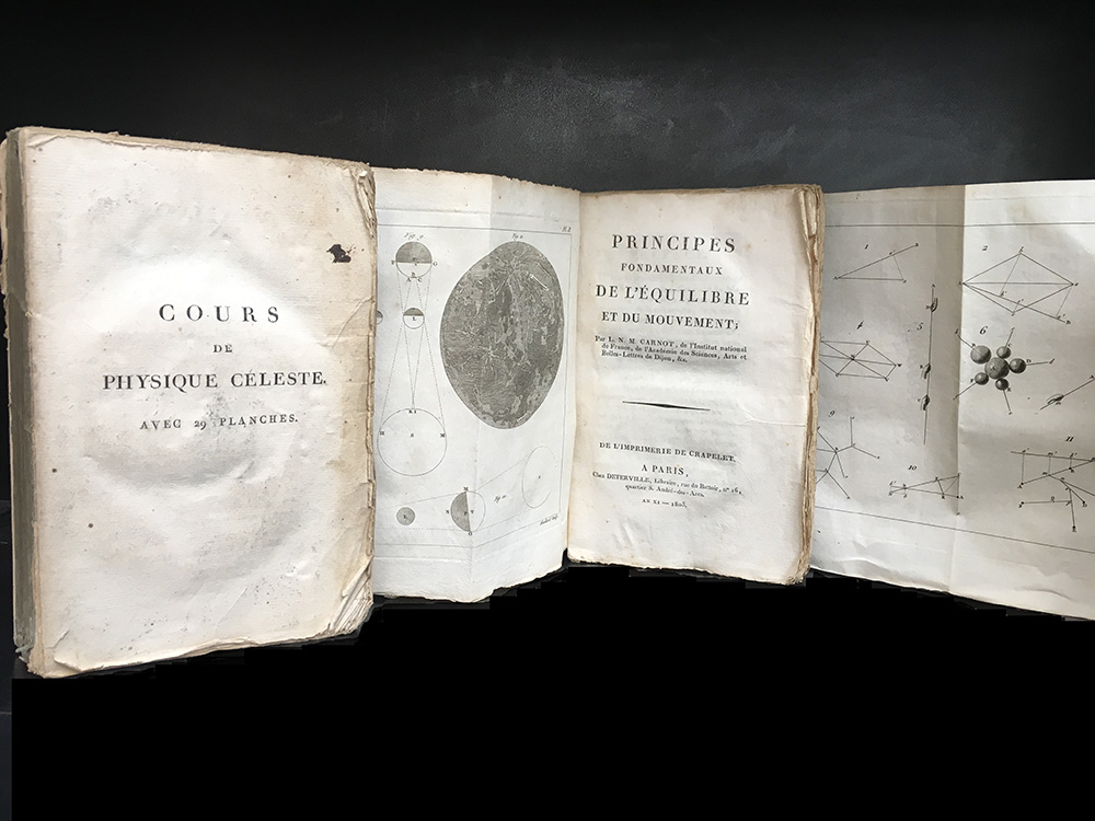 CARNOT ,L.N.M. Principes fondamentaux de l'equilibre et du mouvement. Parigi: Crapelet, 1803. 8vo, brossura coeva azzurra, 2 tavole incise in rame e ripiegate [INSIEME A:] - HASSENFRATZ, Jean-Henri. Cours de Physique Celeste; ou, Lecons sur l'Exposition du Systeme du Monde donnAes a l'Acole Polytechnique en l'An Dix. Parigi: Librairie Economique, 1803. 8vo, numerose tavole incise in rame legate in fine, brossura coeva in gran parte persa come anche ultima tavola. Non collazionato e difetti da esaminare.
