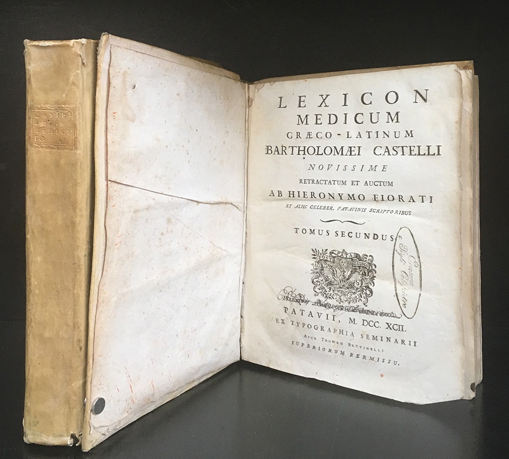 CASTELLI Bartolomeo.Lexicon medicum graeco-latinum. Padova: Tipografia del Seminario, 1792.2 voll 4to. Legatura coeva in piena pergamena con titolo in oro al dorso. Qualche difetto. Non collazionato e difetti da esaminare.