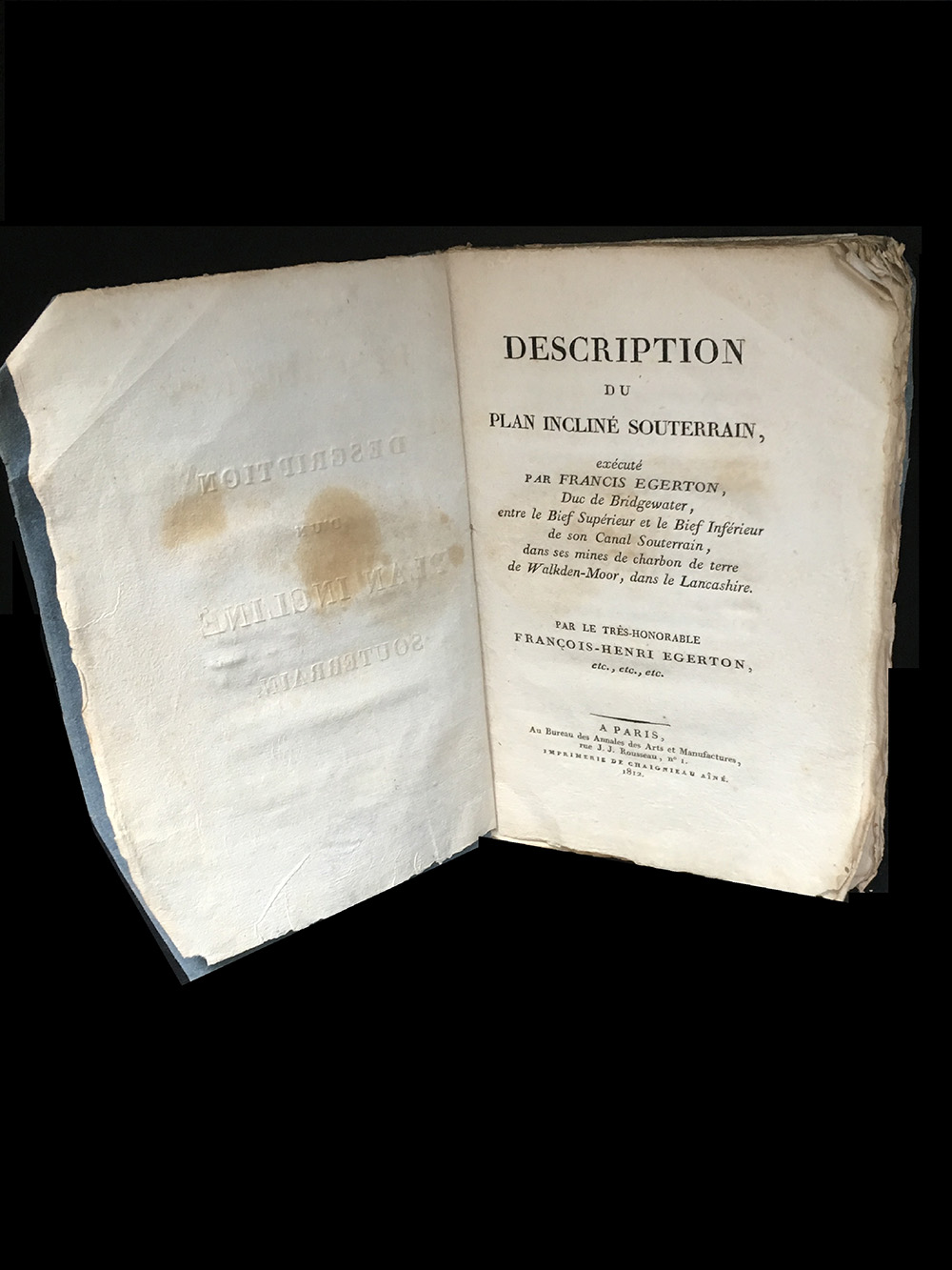 EGERTON F. H. Description du plan incliné souterrain, exécuté par Francis Egerton, Duc de Bridgewater, entre le bief supérieur et le bief inférieur de son canal souterrain, dans ses mines de charbon de terre de Walkden-Moor, dans le Lancashire. Parigi: Chaignieau Aîné, 1812. 8vo, brossura coeva, una tavola ripiegata. Non collazionato e difetti da esaminare.
