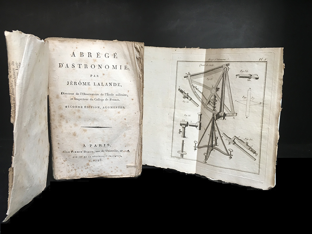 LALANDE, Joseph Jerome Le Francais de (1732-1807). Abrege d'Astronomie. Parigi: Firmin Didot, 1795. 8vo, brossura coeva azzurra (in parte persa), 15 tavole incise in rame legate in cima. Non collazionato e difetti da esaminare.