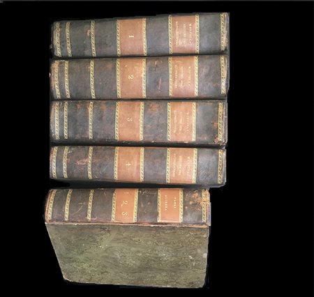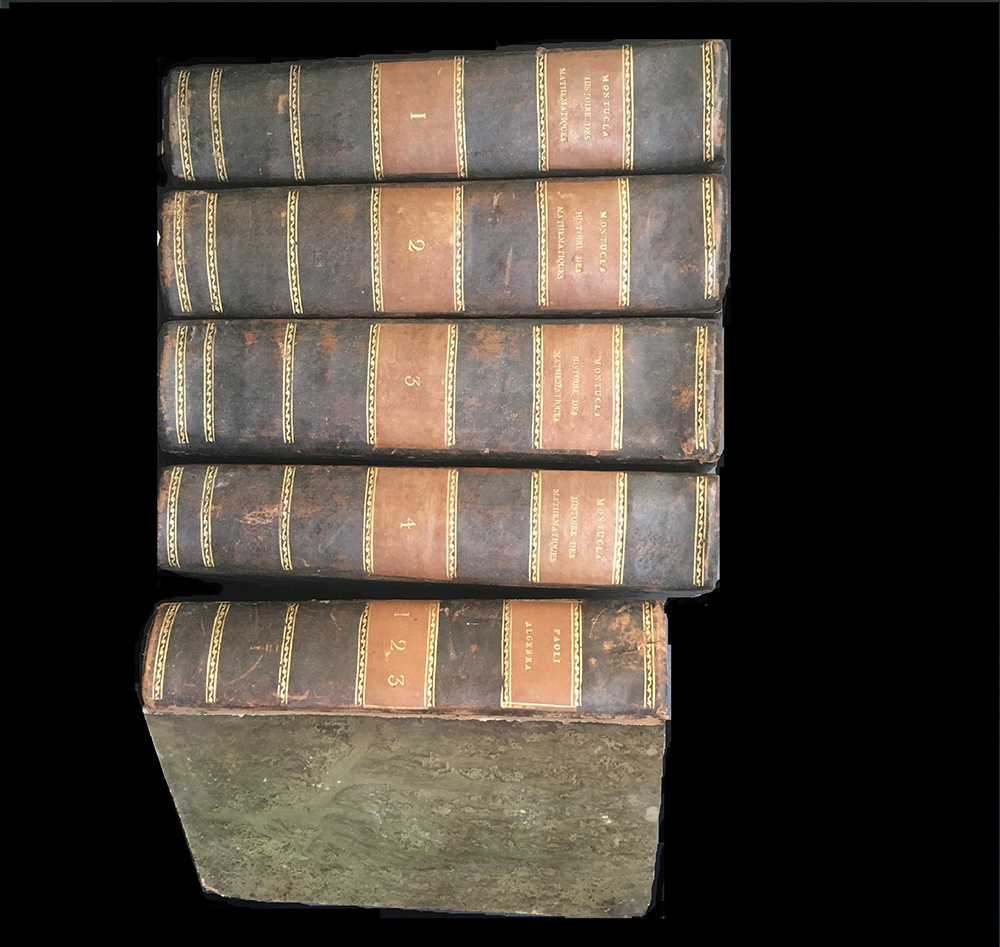 MONTUCLA J.F. Histoire des Mathematiques. Parigi: Agasse, 1799-1802. 4to, 4 voll. Legatura coeva in mezza pelle con titiolo e decori in oro al dorso, tagli a spruzzo. Nel lotto anche una copia dell'Algebra di Paoli in legatura simile. Buona copia dell'edizione ampliata della celebre storia della matematica di Montucla, prima nel suo genere. Non collazionato e difetti da esaminare.