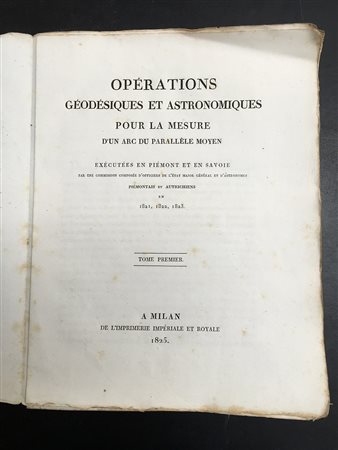 [PLANA, CARLINI, D'ISASCA, PORRINO, CASALEGNO, CAMPANA, BRUPACHER]. Opérations géodésiques et astronomiques pour la mesure d'un Arc de Parallèle moyen, exécutées en Piémont et Savoie par une Commission composée d'Officiers de l'État Majeur Général et d'Astronomes Piémontais et Autrichiens en 1821-23. Milano: Imprimerie Imperiale et Royale, 1825. Folio, solo un volume, numerose carta topografiche e tabelle statistiche. Brossura editoriale stampata in nero (manca copertina). Non collazionato e difetti da esaminare.