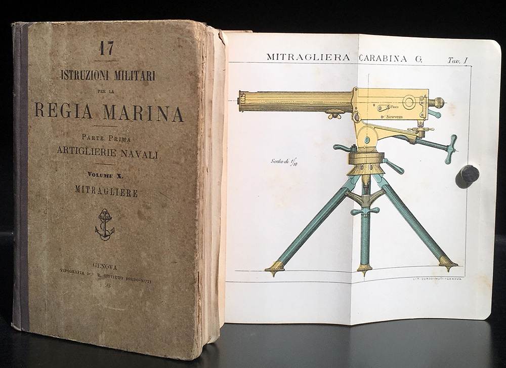 [ARTIGLIERIA] Istruzioni militari per la regia marina. Artiglierie navali, parte prima, mitragliere. Genova: Istituto sordo-muti, 1893. 12mo, numerose tavole cromolitografoche ripiegate, legatura editoriale stampata. Volume che riunisce l'arsenale di mitragliatrici e mitraglie pesanti della Regia marina sul finire del XIX secolo. Non collazionato e difetti da esaminare.