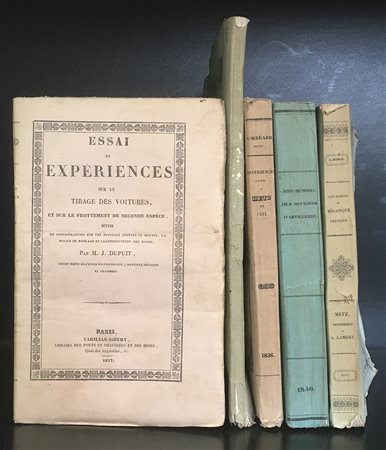 [ARTIGLIERIA] Lotto di 5 opere sull'arma dell'artiglieria: DUPUIT M. J. Essai et experiences sur le tirage des voitures. 8vo, 1 grande tavola ripiegata. brossura editoriale stampata; Experiences sur les batteries de Breche. Parigi: Correard, 1836. 8vo, brossura editoriale stampata; Aide-mèmoire a l'usage des officiers d'artillerie. Parigi: Levrault, 1836. 8vo, 14 tavole, brossura editoriale stampate; MORIN, A. aide-mémoire de mécanique pratique. Parigi: Mathias, 1837. 8vo, illustrazioni nel testo, brossura editoriale stampata. MORIN A. Expériences sur le tirage des voitures faites. Metz, Thiel, 1839. Folio, 2 tavole ripiegat brossura editoriale stampata. Non collazionato e difetti da esaminare.