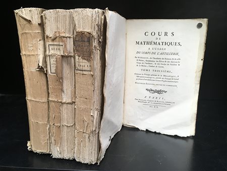 BEZOUT, E.Cours de Mathématiques, à l'usage du corps de l'Artillerie. Parigi: Richard, Ann VII-VIII [1799-1800]. 8vo, 4 voll. 28 tavole più volte ripiegate. Legatura coeva in brossura con titolo su tassello al dorso (difetti e mancanze). Non collazionato e difetti da esaminare.