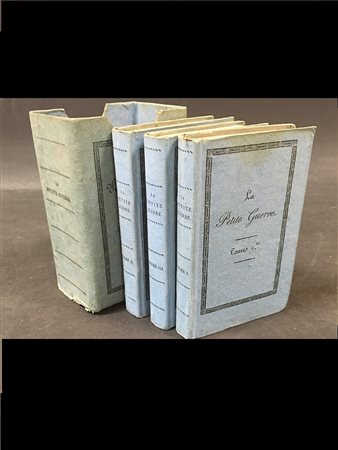 BIBLIOTHEQUE PORTATIVE DE L'OFFICIER. La Petite Guerre. Parigi: Levrault. 1837. 3 voll. 16mo, 12 tavole acquarellate più volte ripiegate. Bella brossura coeva in carta azzurra con titolo stampato ai piatti e al dorso, cofanetto editoriale stampato,. Non collazionato e difetti da esaminare.