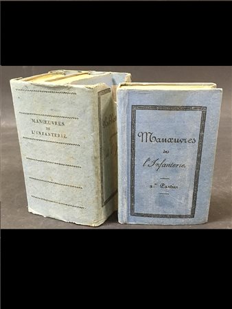 BIBLIOTHEQUE PORTATIVE DE L'OFFICIER. Ordonnace du Roi du 4 Mars 1831 sur l'exercice et les manoeuvres d l'infanterie. Parigi, Levrault. 1831. 16mo, fioriture. Bella brossura coeva in carta azzurra con titolo stampato ai piatti e al dorso, cofanetto editoriale stampato,. Non collazionato e difetti da esaminare.