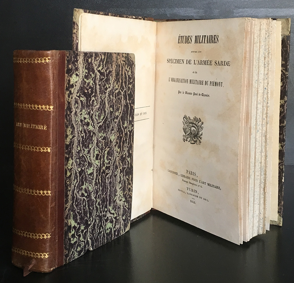 [FORTIFICAZIONI] Aide-Memoire portatif d'art militaire et de fortification. Parigi: J. Dumaine e G. Laguionie, 1843. 16mo, bella copia in mezza pelle coeva, numerosissime tavole ripiegate. Insieme a un volume dello stesso anno in 8vo in legatura uniforme di studi militari "specimen de l'armée Sarde". Non collazionato e difetti da esaminare.