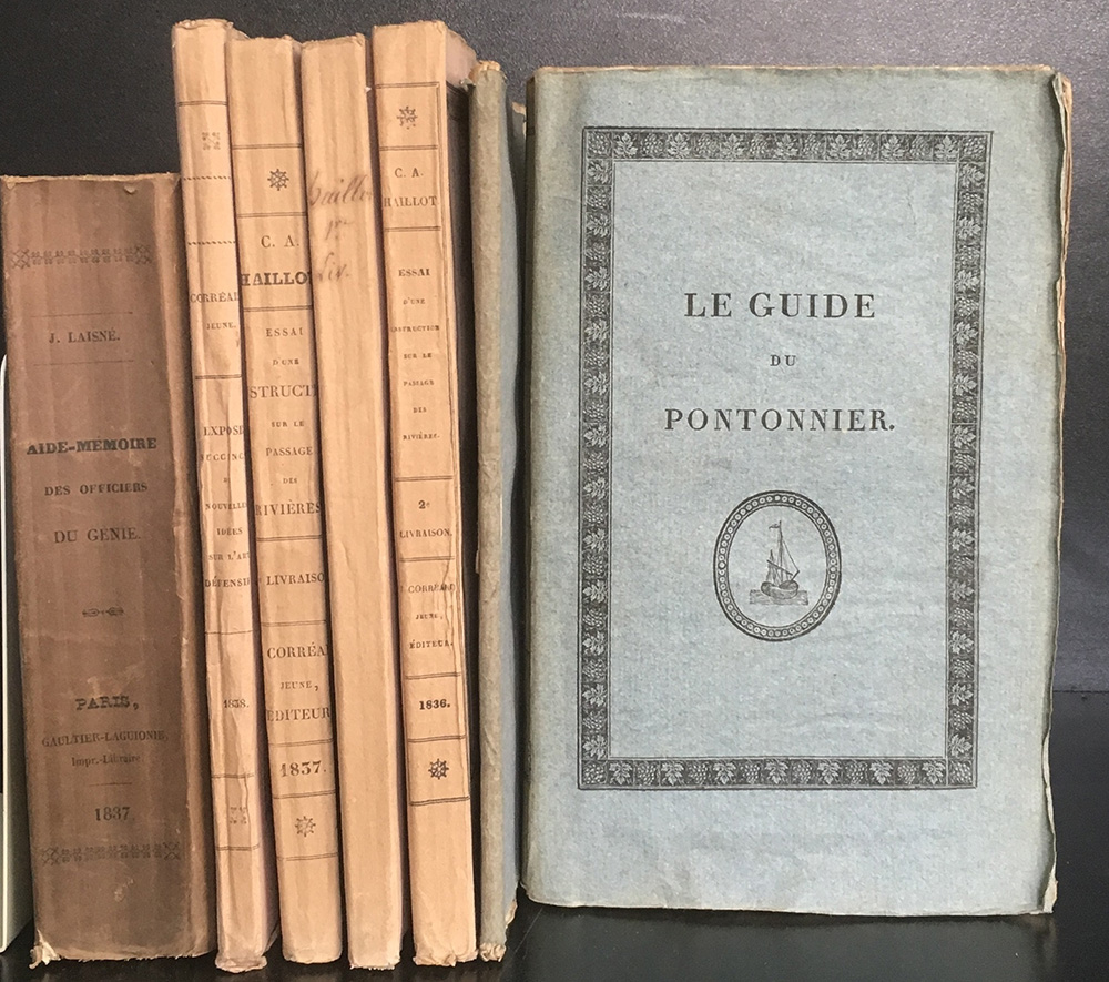 [GENIO] Lotto di 4 opere illustrate relative al corpo del genio pontieri. DRIEU A. F. Le guide du pontonnier. Parigi: Levrault, 1820, 5 tavole di cui una più volte ripiegata. brossura editoriale stampata. HAILLOT C. A. Essai d'une instruction sur le passage des rivieres. Parigi: Correard Jeaune, 1835. 8vo, 4 voll, numerose tavole più volte ripiegate brossura editoriale coeva. Non collazionato e difetti da esaminare.