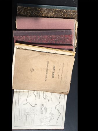 Lotto composto da 8 volumi riguardanti corsi tenuti presso l'accademia militare di modena nel decennio del 1870. Tra i presenti si segnalano due atlanti di tavole di fortificazioni dove si possono trovare nuove idee belliche quali una postazione lancia siluri terrestre. Non collazionato e difetti da esaminare.