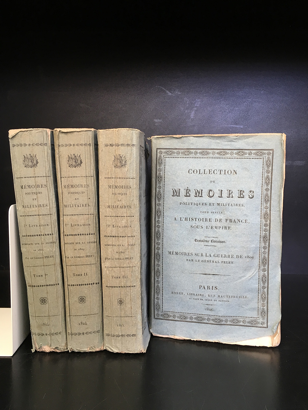 [NAPOLEONICA] PELET J. J. G. Mémoires sur la guerre de 1809 en Allemagne. Parigi: Roret, 1824-26. 4 voll, 4to, 2 tabelle più volte ripiegate. Legatura in brossura coeva. Importante resoconto militare redatto dal Generale Pelet, aiutante di campo di Massena in Portogallo e comandante della Vecchia Guardia a Waterloo, apprezzato per la sua accuratezza. Non collazionato e difetti da esaminare.
