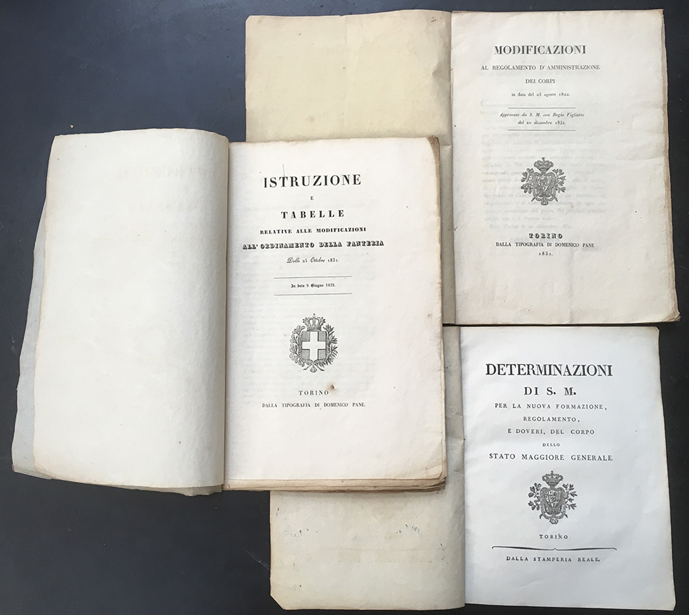 [REGOLAMENTI] lotto di 3 rari regolamenti dell'esercito del regno di Sardegna: Determinazioni di S.M. per la nuova formazione, regolamento, e doveri del corpo dello stato maggiore generale. Torino: Stamperia reale, 1816. 4to, brossura coeva; Modificazioni al regolamento d'amministrazione dei corpi. Torino: Pane, 1831. Folio, brossura coeva; Istruzioni e tabelle relative alle modificazioni all'ordinamento della fanteria. Torino: Pane, 1831. Folio, 11 tabelle ripiegate. Brossura coeva. Bel set di . Non collazionato e difetti da esaminare.
