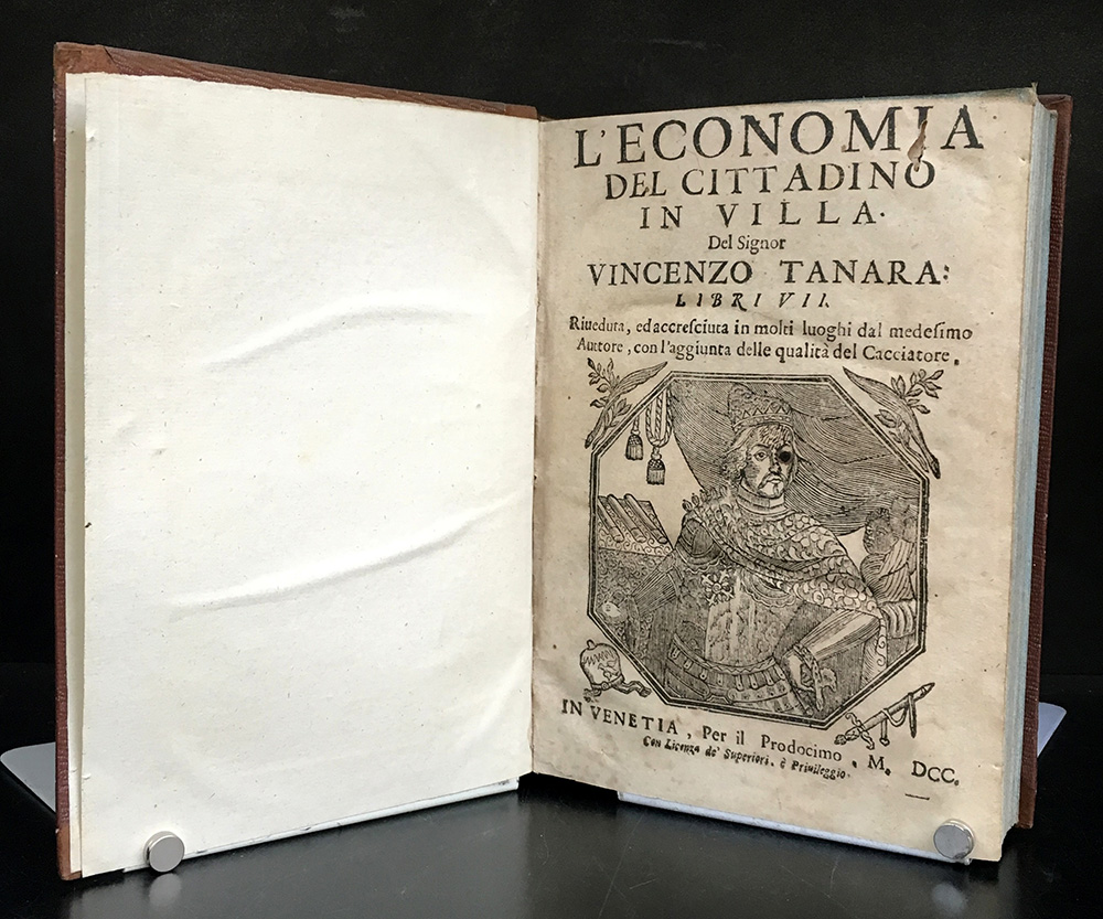 TANARA, Vincenzo. L’economia del cittadino in villa libri VII. Venezia: Per il Prodocimo, 1713. 4to, bella e grande xilografia al frontespizio. Mezza pelle moderna. Non collazionato e difetti da esaminare.