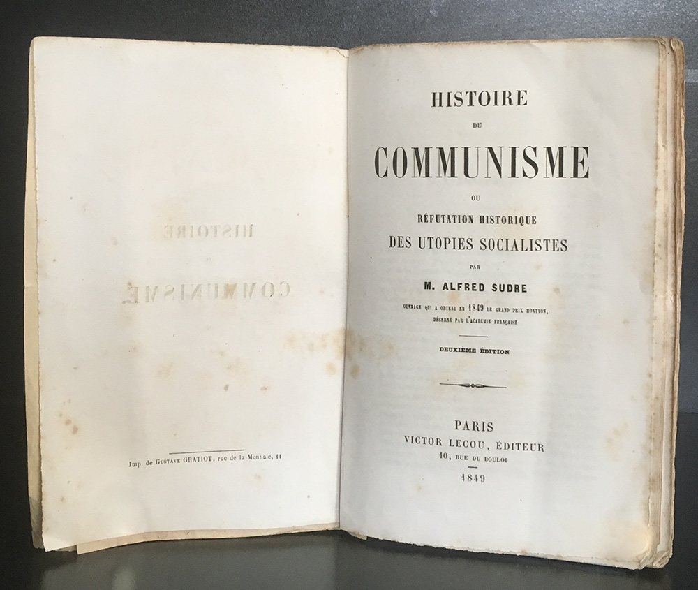 SUDRE M. A. Histoire du Comunisme. Parigi: Lecou, 1849. 8vo, brossura editoriale stampata. seconda edizione, contemporanea alla prima, di uno dei primi studi sul comunismo. Non collazionato e difetti da esaminare.