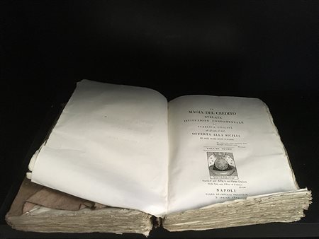 WELZ Giuseppe (de). La magia del credito svelata istituzione fondamentale di pubblica utilità. NapolI: stamperia francese, 1824. Folio, 2 voll, Tavole nel testo (manca la tavola acquarellata) Brossura coeva con titolo manoscritto al dorso. Prima edizione. L'opera, scritta da Francesco Fuoco che cedette i diritti a Welz. è uno studio per lo sviluppo del sistema finanziario nel Regno delle Due Sicilie. Tra i primi e più esaustivi trattati italiani in materia di debito pubblico e amministrazione finanziaria statale. Non collazionato e difetti da esaminare.