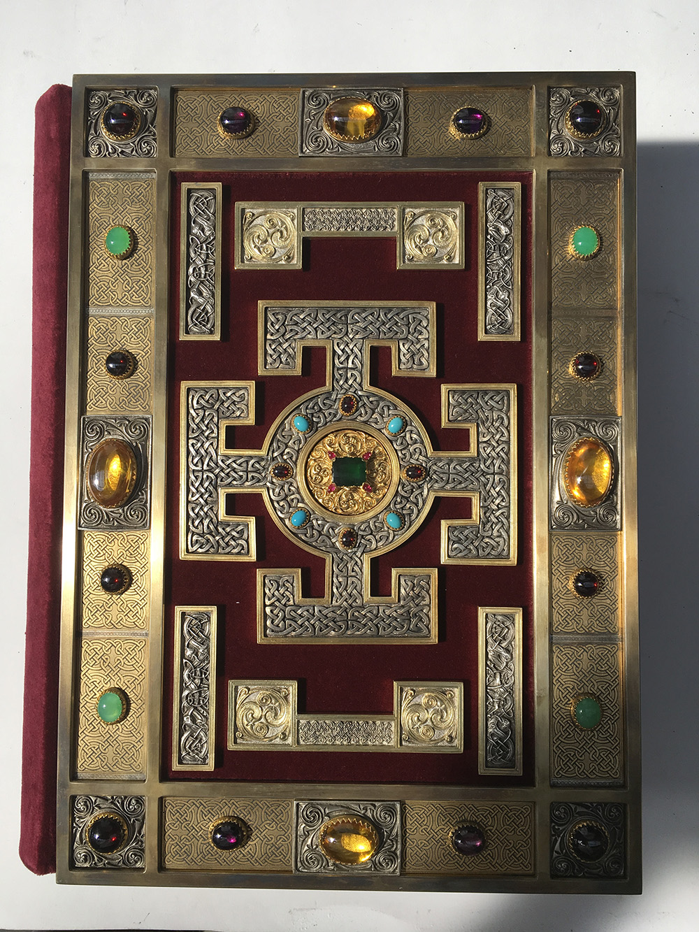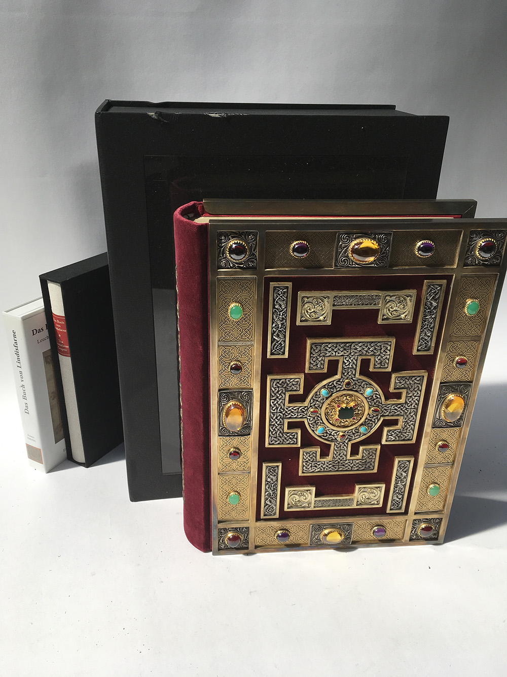 Das Buch von Lindisfarne. Lucerna: Faksimile Verlag Luzern, 2002. Copia n. 62 di 290. Entro cofanetto in similpelle nera. Corredato da un volume di commentario di Michelle P. Brown e da una videocassetta. Legatura in velluto cremisi, ai piatti placche in metallo lavorato e gemme (granati, turchesi, ametiste, crisoprasi, citrini, rubini e smeraldo), sul dorso ricamo con filo d'argento. In perfette condizioni (eccetto una sfregatura al cofanetto)