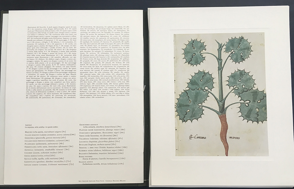 MAGISTER ANTONIO DE PADUA. Erbolario Bergomense. Milano: edizioni Della Beffa, sd. In-folio grande; edizione numerata in cartella editoriale. La cartella si compone di un testo esplicativo e 24 tavole in fac-simile a colori del codice del 1441 con figure di piante e fiori. Non collazionato e difetti da esaminare.