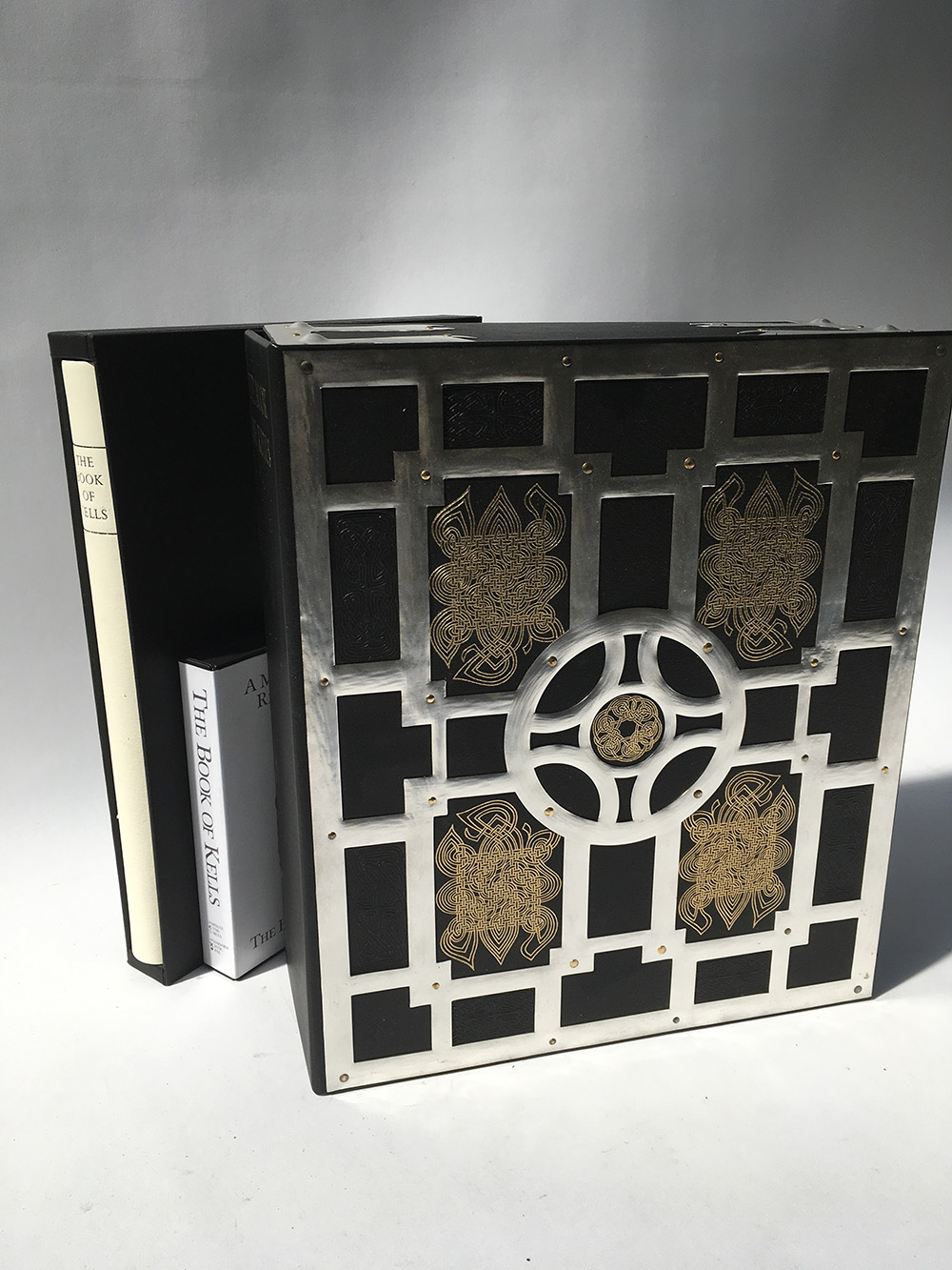 The Book of Kells. Facsimile del sec. VIII. Lucerna: Fine Art Facsimile Publisher of Switzerland/ Faksimile Verlag Luzern, 1990. Copia n. 1425 di 1480. Entro bella custodia in piena pelle marrone con decorazioni a impressione, dorate e con borchie in metallo argentato. Corredato da un volume di commentario in folio di Peter Fox entro astuccio telato nero e videocassetta. Legatura in piena pelle bianca. Perfette condizioni