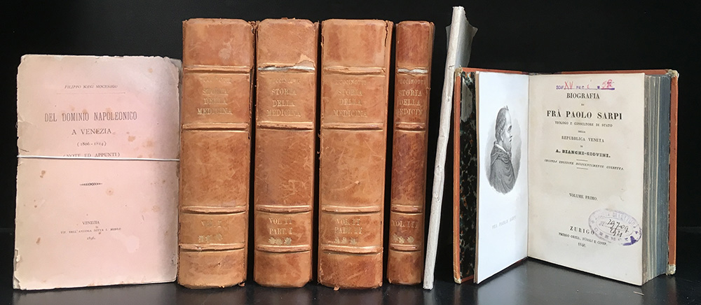 Lotto contenente sette volumi: Paolo SARPI. Biografia, 1846. PUCCINOTTI, Storia della Medicina. 1859 3 volumi. MOCENIGO. Del Dominio Napoleonico. 1896. [E:] Terminazione degl'illustrissimi ed eccellentissimi signori, 1768. Non collazionato e difetti da esaminare.