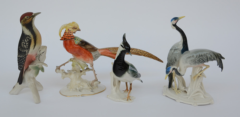 Manifatture tedesche, gruppo di quattro sculture raffiguranti uccelli in...