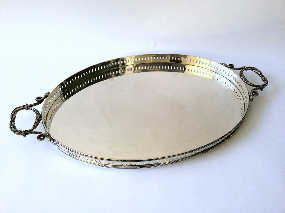 Vassoio ovale in argento con bordo traforato ed anse a forma di serpenti e festoni. Argentiere Prdella Ilario Milano (g 1570 ca) (cm 54x29) (lievi difetti)
