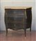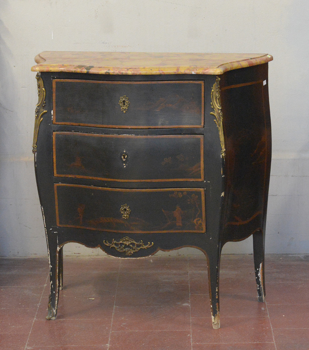 Comoncino di forma mossa a tre cassetti in legno laccato a chinoiserie. Piano in marmo (cm 80x82x40) (difetti)