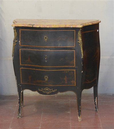 Comoncino di forma mossa a tre cassetti in legno laccato a chinoiserie. Piano...