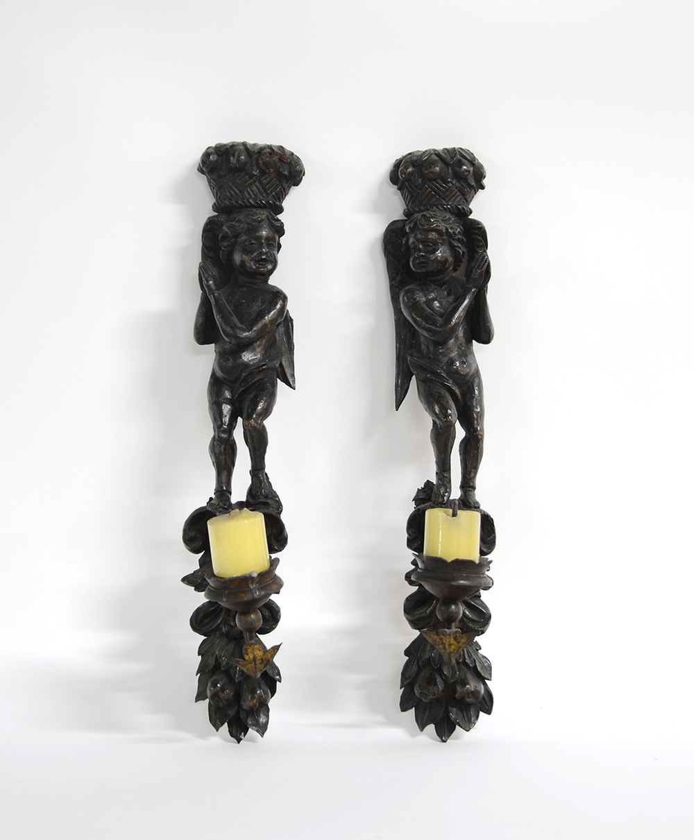 Coppia di antiche lesene in legno scolpito con amorini e mascheroni, montate a reggicero in epoca posteriore (h. cm 56)