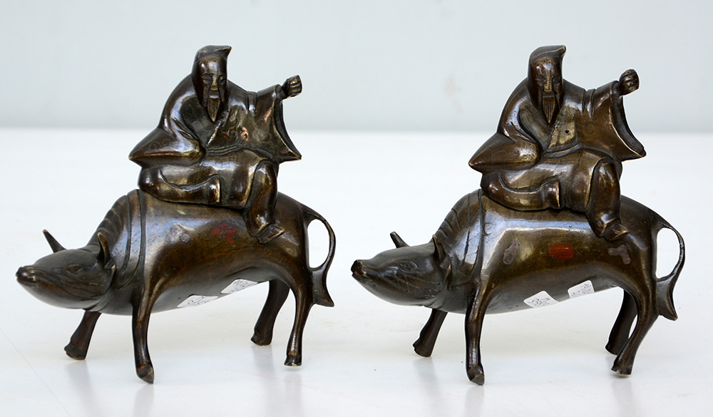 Coppia di piccole sculture in bronzo a due sezioni raffiguranti saggi su bufali (l. max cm 13,5) (difetti e mancanze)