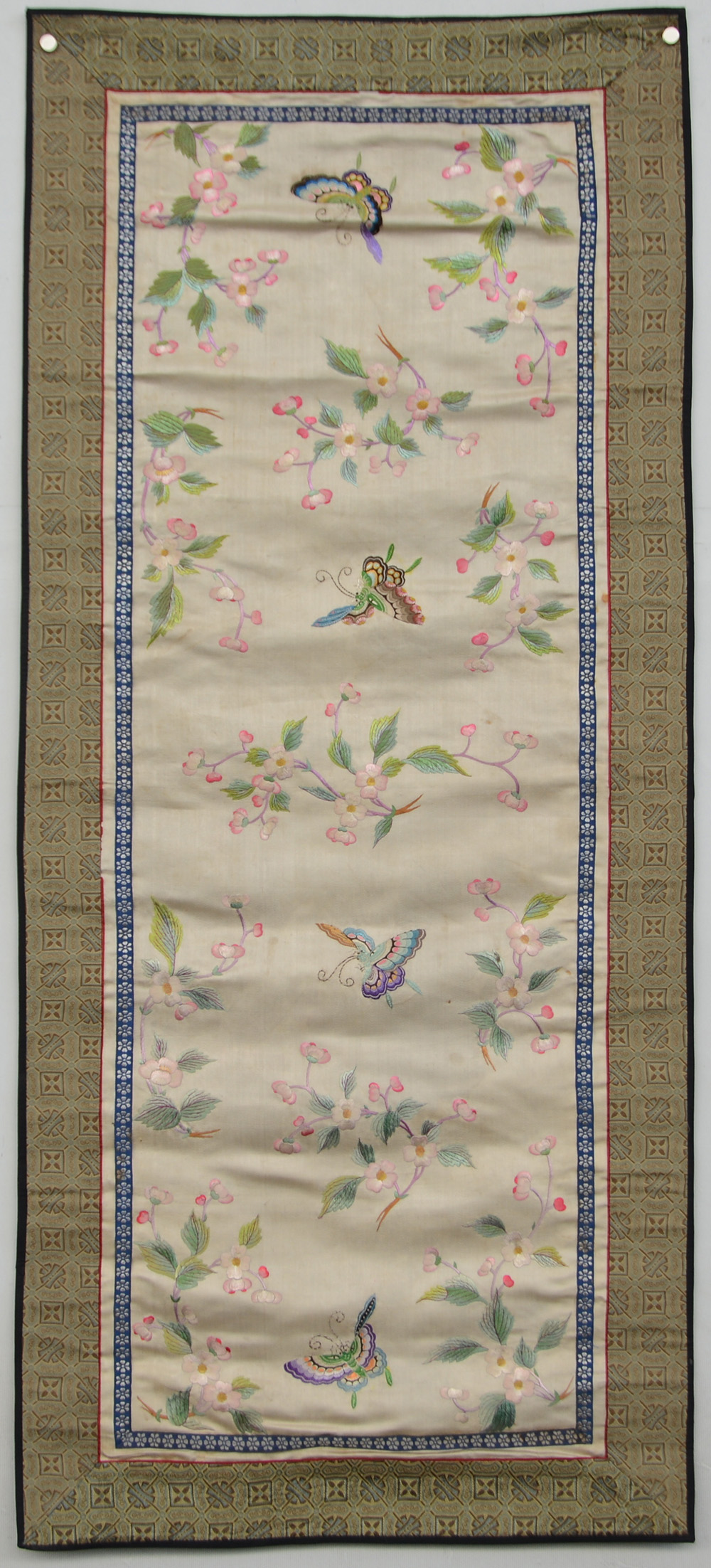 Pannello ricamanto in seta su raso di seta bianco raffigurante farfalle e rami di pesco (cm 93x42) (lievi difetti)