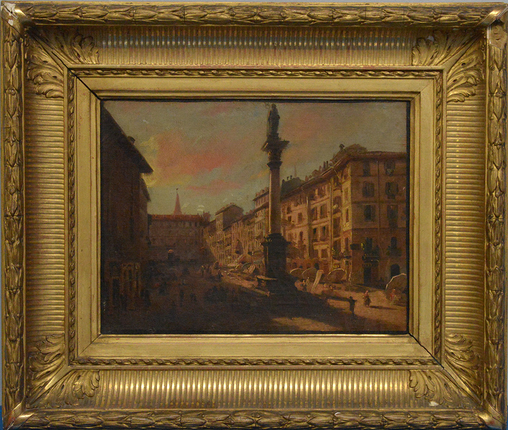 Maestro lombardo del XIX Secolo "La piazzetta del Verziere" olio su tela (cm 25.5x33) Reca iscrizione A,Inganni in basso a sinistra.