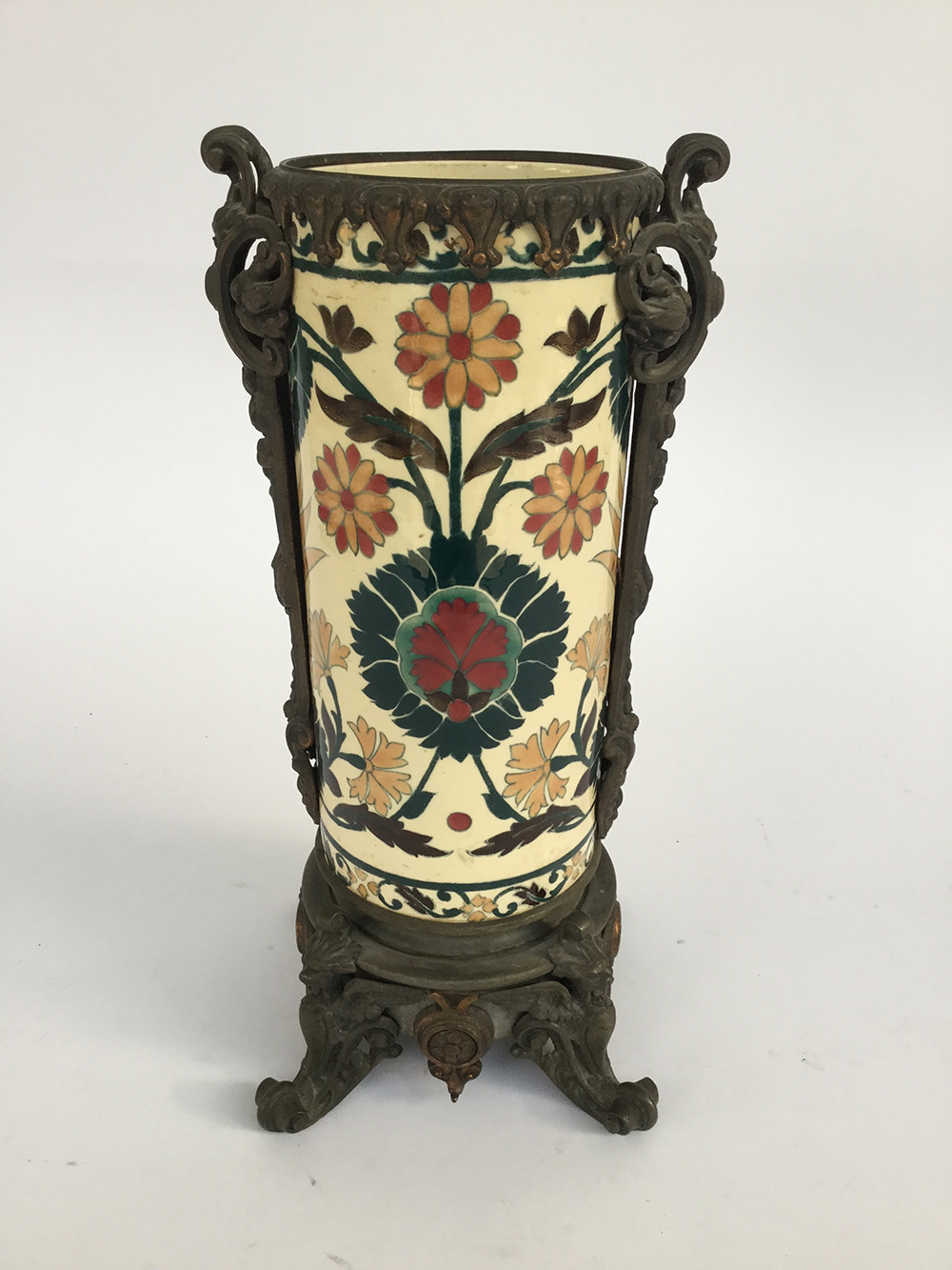 Vaso in ceramica dipinto in policromia a motivi floreali con sostegno e montanti in metallo a volute e teste zoomorfe, fine secolo XIX (h cm 39) (difetti e mancanze)