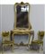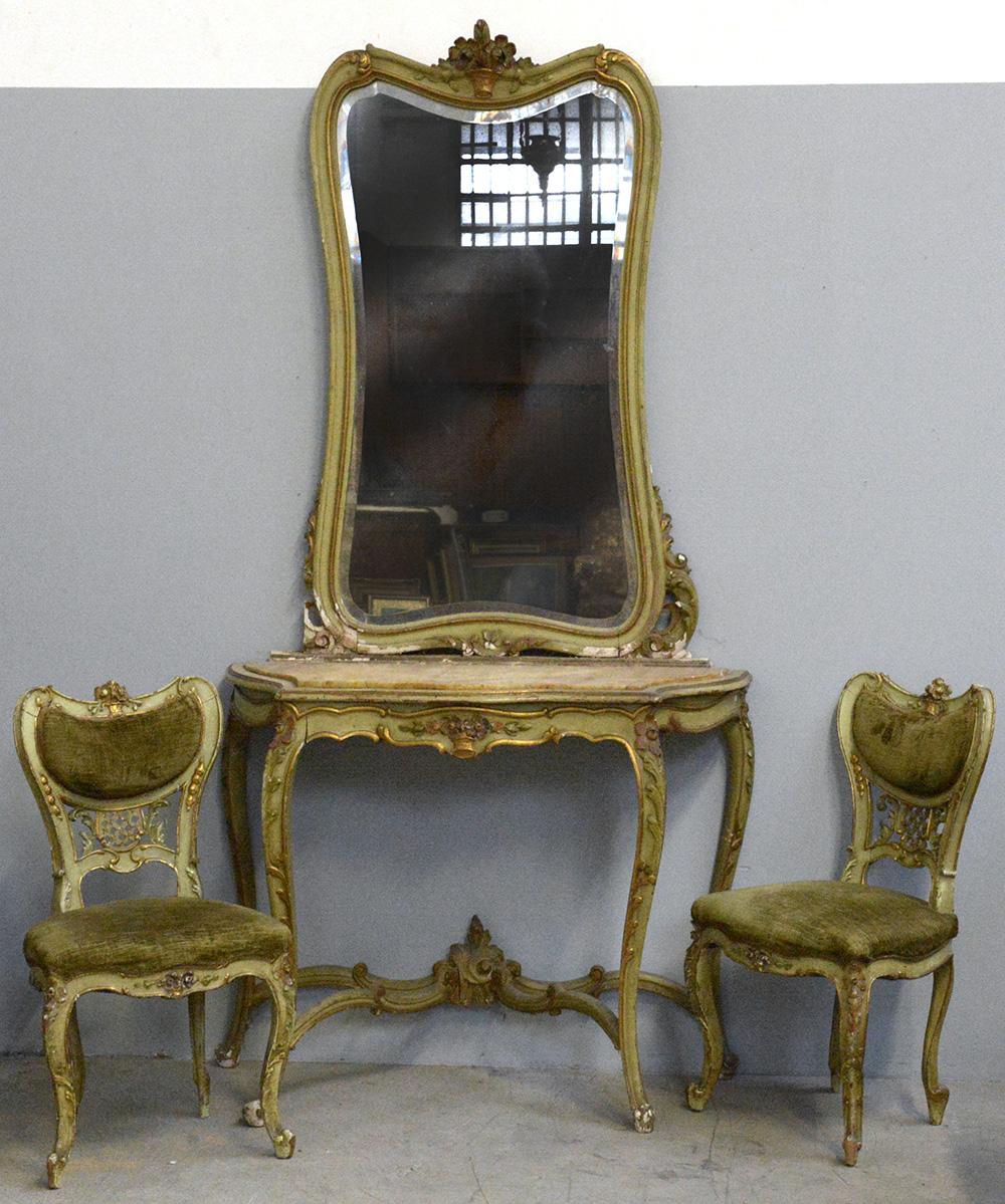 Fornitura da ingresso composta da una consolle con specchiera in legno intagliato e dipinto e piano in marmo, e due sedie en suite con tessuto in velluto verde. (consolle: cm 110x216x44) (difetti e mancanze)