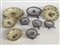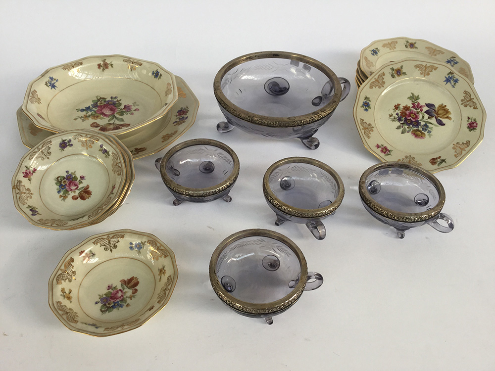 Servizio da macedonia in vetro con decori molati e ghiere in argento, composto da una ciotola e quattro coppetta, unito ad un servizio da macedonia e dolce per sei persone di manifattura tedesca (difetti)